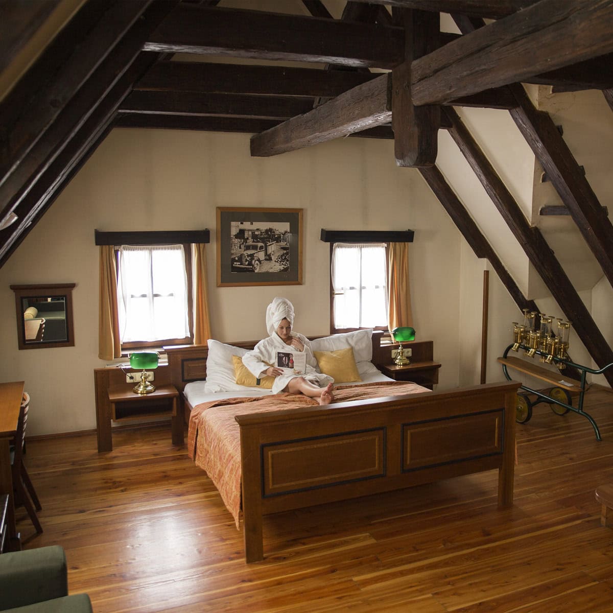 Součástí tohoto unikátního dvoulůžkového pokoje je i pohodlná vana se třemi kohoutky (teplá, studená voda a čepované pivo).