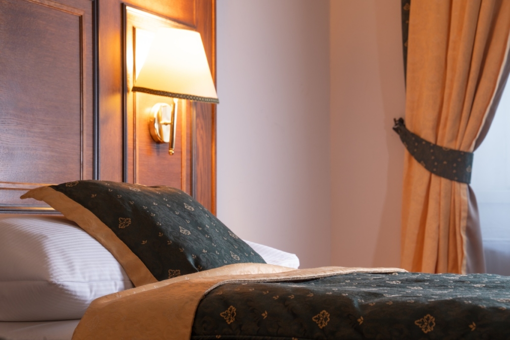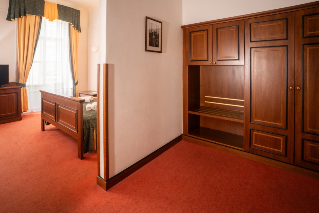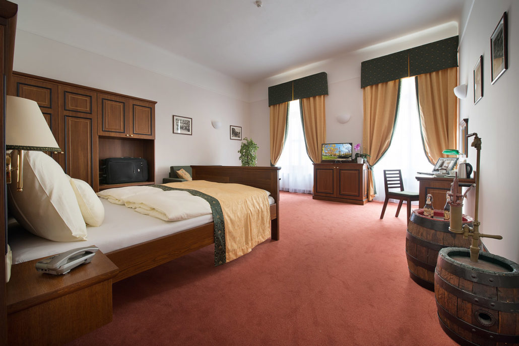 Dvoulůžkový pokoj pro 1-2 osoby. Prosvětlený pokoj (denní světlo) s vlastní koupelnou, posezením a výhledem do klidného dvora nebo na kostel sv. Martina.