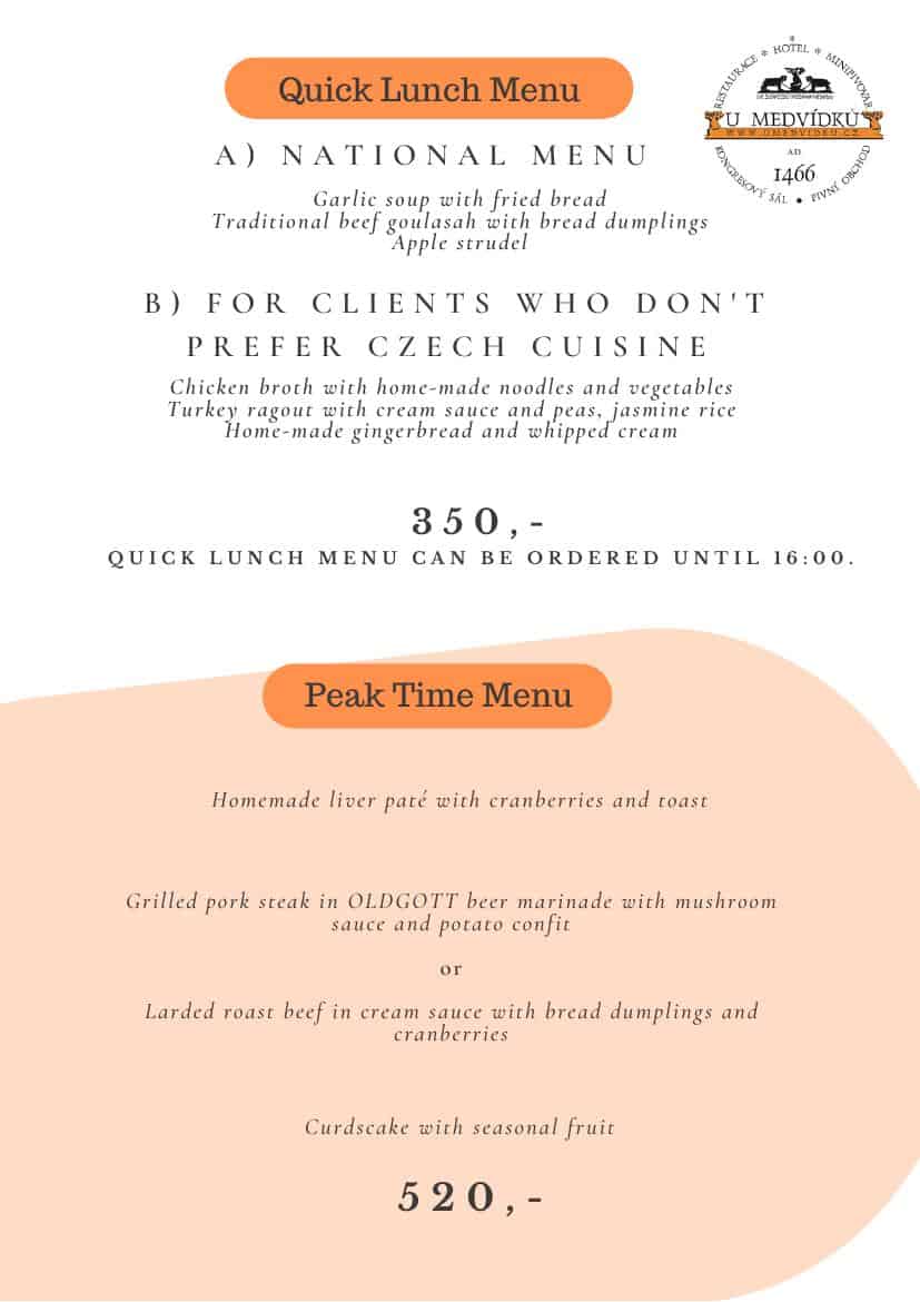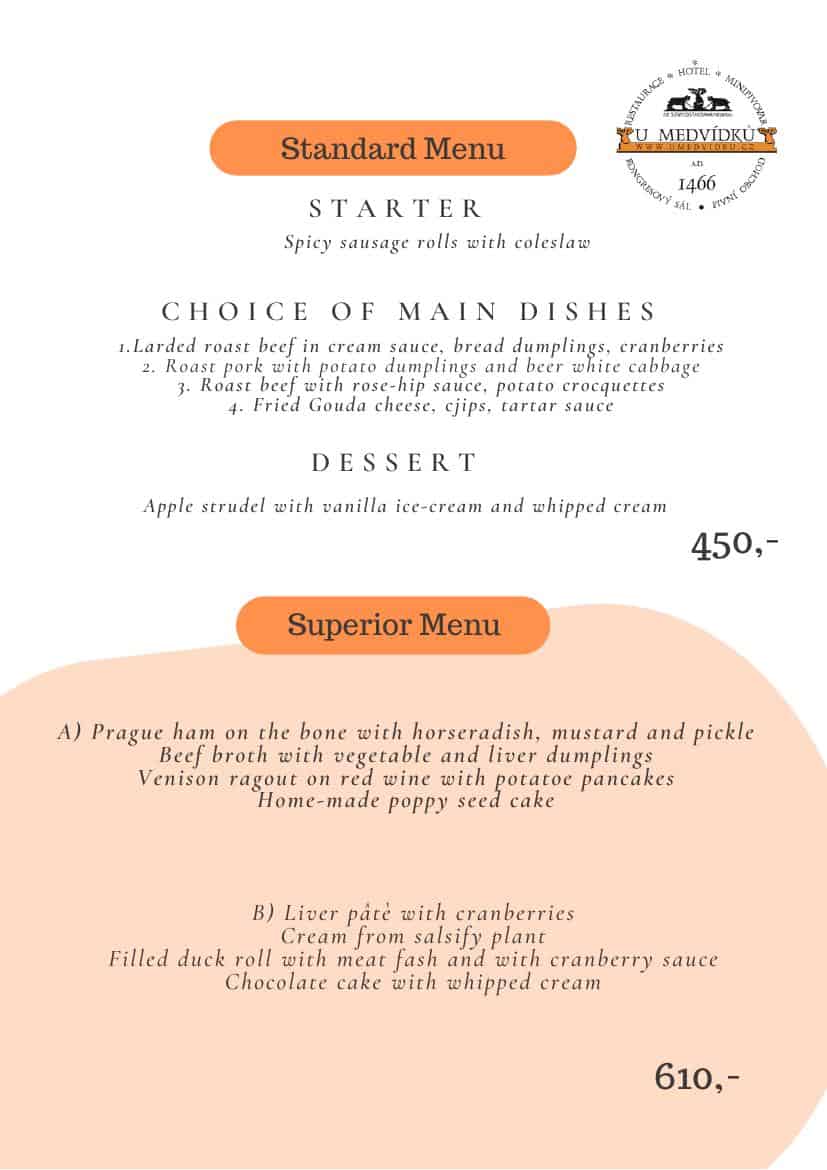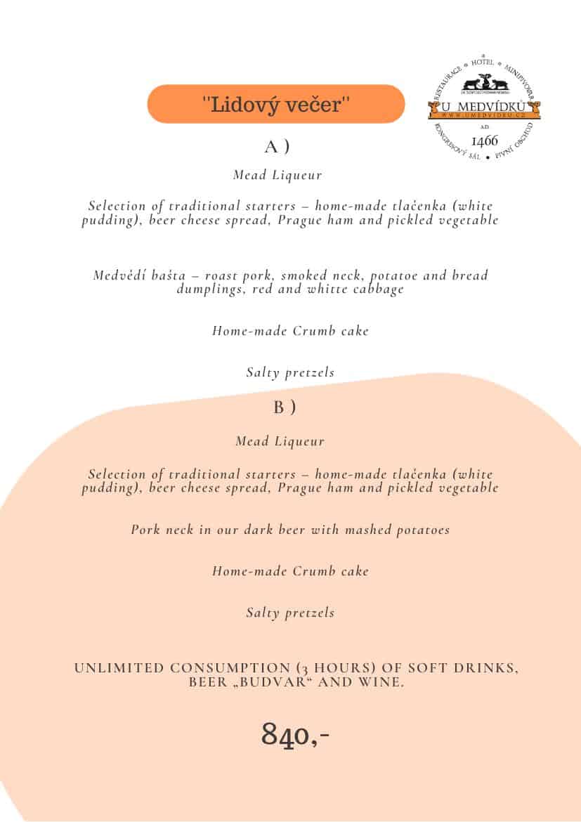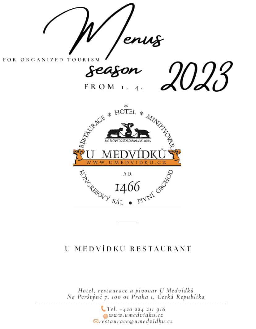 U Medvidku — предложение для туристических агентств в Праге — выбор традиционных чешских или международных меню, народный вечер с группой.